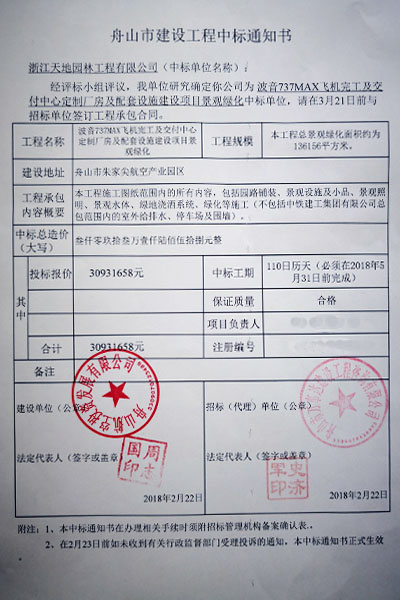 2018年2月22日,我公司中标舟山航空投资发展有限公司的项目:波音737MAX飞机完工及交付中心定制厂房及配套设施建设项目景观绿化工程,项目绿化面积为:136156平方米,合同金额为:30931658元整。