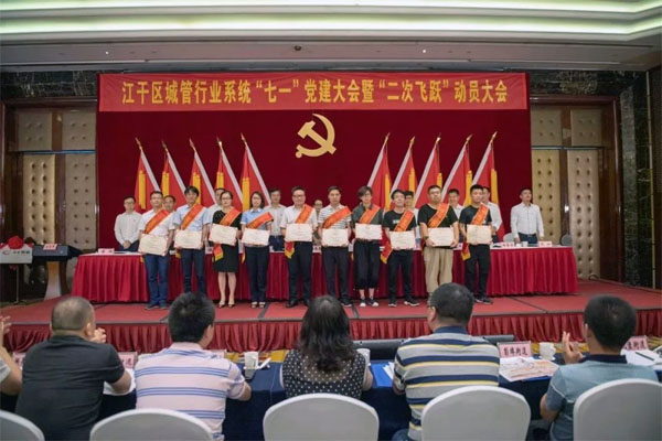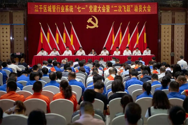 6月27日下午,江干区城管局召开城管行业系统“七一”党建大会暨“二次飞跃”动员大会。杭州市城管局党组副书记杨英英,江干区人民政府副区长史建峰,区政府办分管领导及局党委班子成员、正副调研员,区城管局系统全体党员干部,驿站党委、环境协会党总支、渣土协会党支部班子成员,环境协会、渣土协会成员单位党组织负责人和单位负责人,各街道、管委会城管分管领导、城管科负责人,部分同心圆单位党组织负责人和全体受表彰人员参加大会。