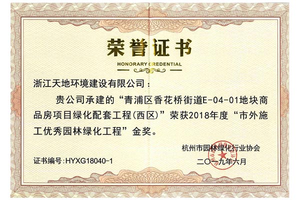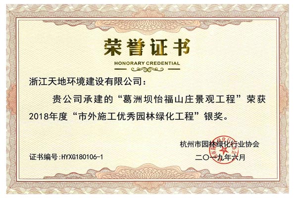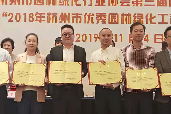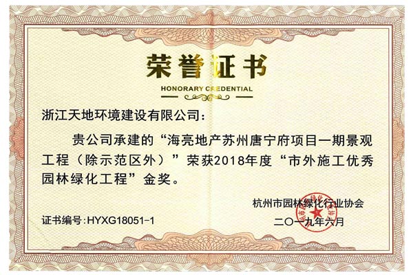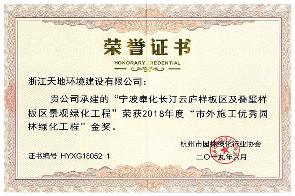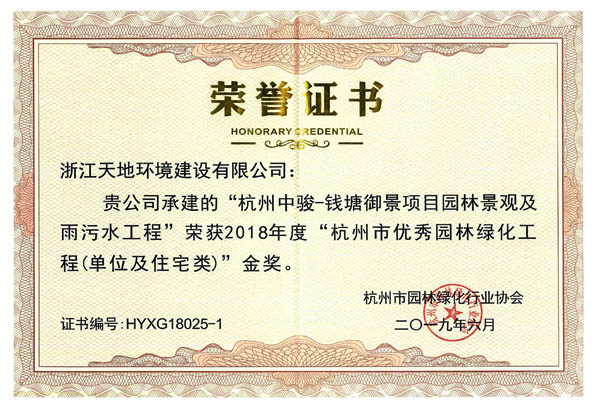 浙江天地环境建设有限公司承建的杭州中骏-钱塘御景项目园林景观及雨污水工程荣获2018年度 “杭州市优秀园林绿化工程(单位及住宅类)”金奖,青浦区香花桥街道E-04-01地块商品房项目绿化配套工程、海亮地产苏州唐宁府项目一期景观工程、宁波奉化长汀云庐样板区及叠墅样板区景观绿化工程获2018年度市外施工“优秀园林绿化工程”金奖,葛洲坝怡福山庄景观工程获2018年度市外施工“优秀园林绿化工程”银奖,另杭州中骏-钱塘御景项目园林景观及雨污水工程、青浦区香花桥街道E-04-01地块商品房项目绿化配套工程、海亮地产苏州唐宁府项目一期景观工程、宁波奉化长汀云庐样板区及叠墅样板区景观绿化工程的项目经理姜娟红、钟凌烽、胡红卫等获2018年度杭州市园林绿化工程“优秀项目负责人”荣誉称号。
