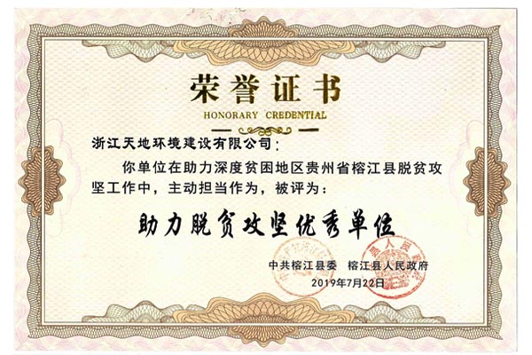 2019年11月4日,在杭州市园林绿化行业协会举办的三届四次会员大会暨“2018年杭州市优秀园林绿化工程奖”颁奖大会上,浙江天地环境建设有限公司在助力深度贫困地区贵州省榕江县脱贫攻坚工作中被中共榕江县委、榕江县人民政府评为“助力脱贫攻坚优秀单位”称号。