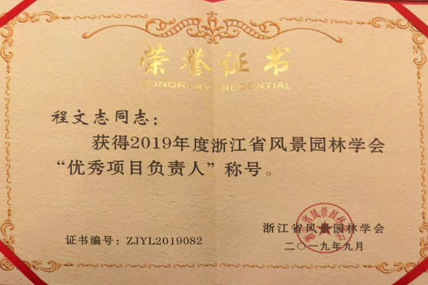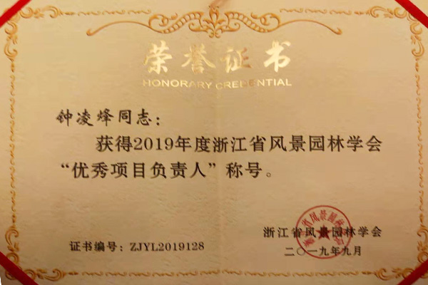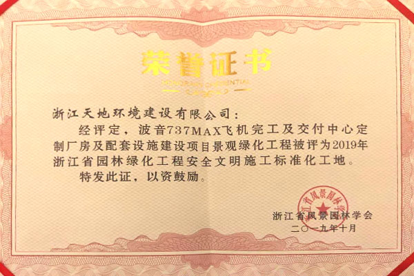 2019年11月29日,在浙江省第九届“园林人居”论坛暨2019年度“优秀园林工程”奖颁奖大会上,浙江天地环境建设有限公司承建的三门县城A03—0107、A03—0201地块景观绿化工程、海亮地产苏州唐宁府项目一期景观工程、中国园博会杭州园建设(南宁)工程等三个工程项目荣获2019年度浙江省“优秀园林工程”奖金奖,波音737MAX飞机完工及交付中心定制厂房及配套设施建设项目景观绿化工程被评为“2019年浙江省园林绿化工程安全文明施工标准化工地”,公司工程副总吴迪同志被评为“浙江省风景园林学会30周年先进个人”称号,程文志,钟凌烽等同志获得优秀项目负责人称号。