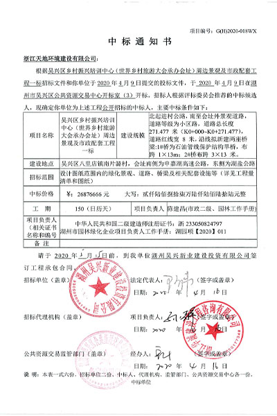 我司参与吴兴区乡村振兴培训中心(世界乡村旅游大号承办会址)周边景观及市政配套项目工程一标项目。公司积极组织人员,通过各部门团结协作、高效率、高质量完成了投标文件的编制工作,并以贰仟多万的价格在此次项目公开招标中一举中标。