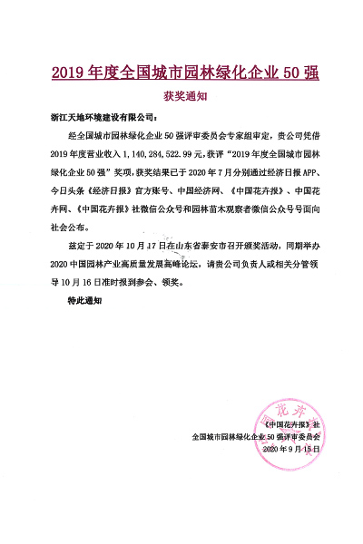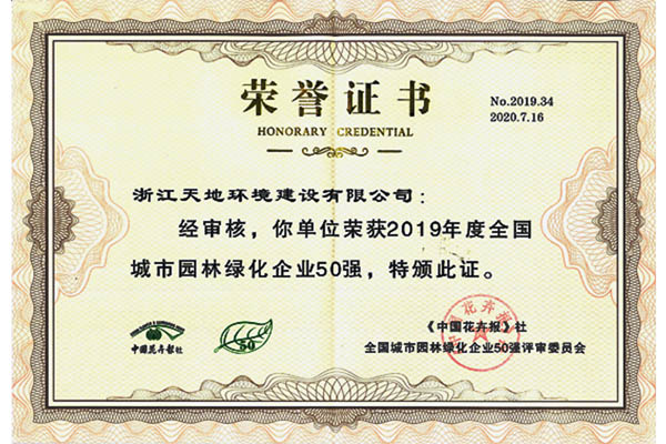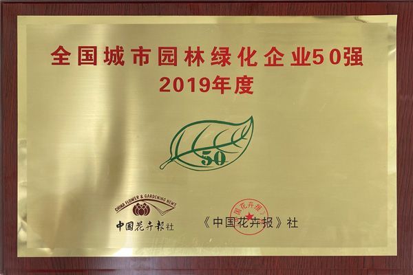 喜报:我司获得2019年度全国园林企业50强称号