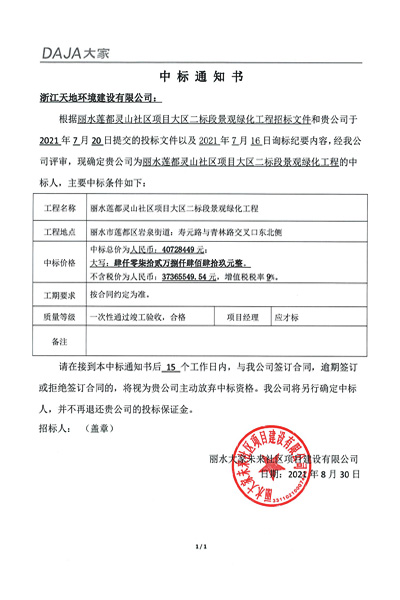 2021年8月30日,我公司中标丽水莲都灵山社区项目大区二标段景观绿化工程,该项目由丽水大家未来社区项目建设有限公司招标,项目合同价为40728449元。