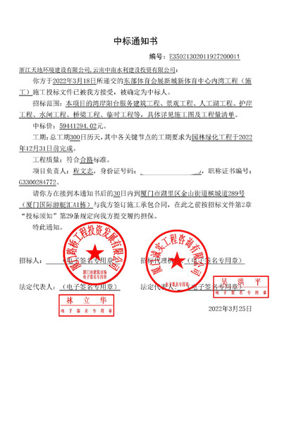 2022年03月25日,我司联合中标由厦门市体育局招标的项目,东部体育会展新城新体育中心内湾工程(施工),中标金额为28024574.02元。