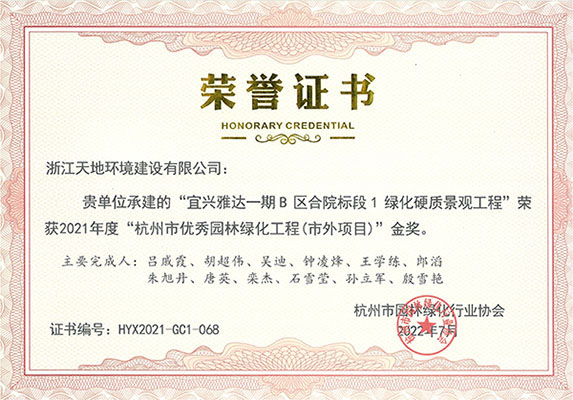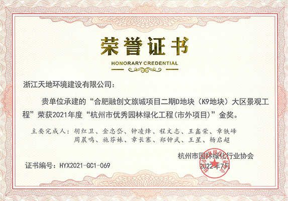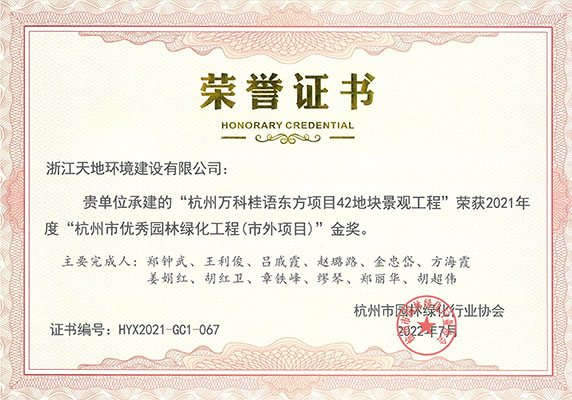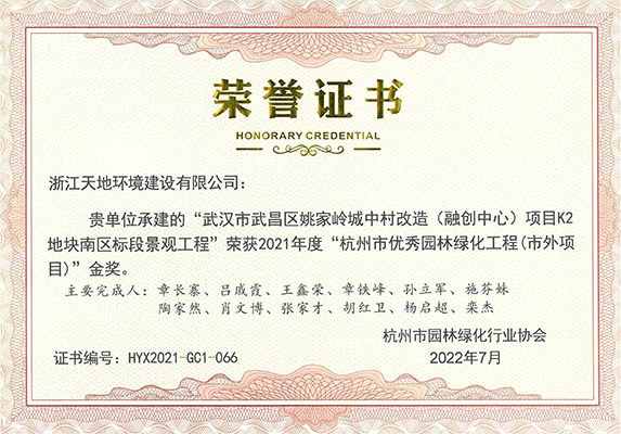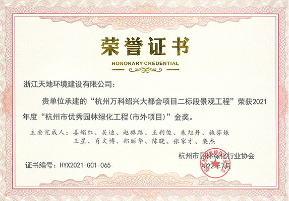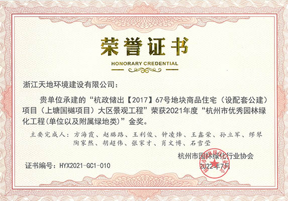2022年10月13日,杭州市园林绿化行业协会在杭州召开的2021年度“杭州市优秀园林绿化工程”颁奖大会,由浙江天地环境建设有限公司承建的“杭政储出【2017】67号地块商品住宅(设配套公建)项目(上塘国樾项目)大区景观工程”、“武汉市武昌区姚家岭城中村改造(融创中心)项目K2地块南区标段景观工程(武汉壹号院) ”、“杭州万科桂语东方项目42地块景观工程”、“杭州万科绍兴大都会项目二标段景观工程”、“宜兴雅达一期 B区合院标段1绿化硬质景观工程”、“合肥融创文旅城项目二期D地块(K9地块)大区景观工程 (望海潮项目)”;以及由公司设计的“义乌市警察文化展示基地项目”7个项目荣获园林绿化工程金奖。