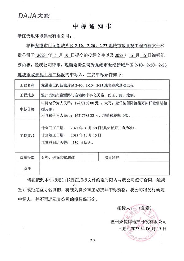 龙港市世纪新城片区2-10、2-20、2-23地块市政景观工程,中标金额为