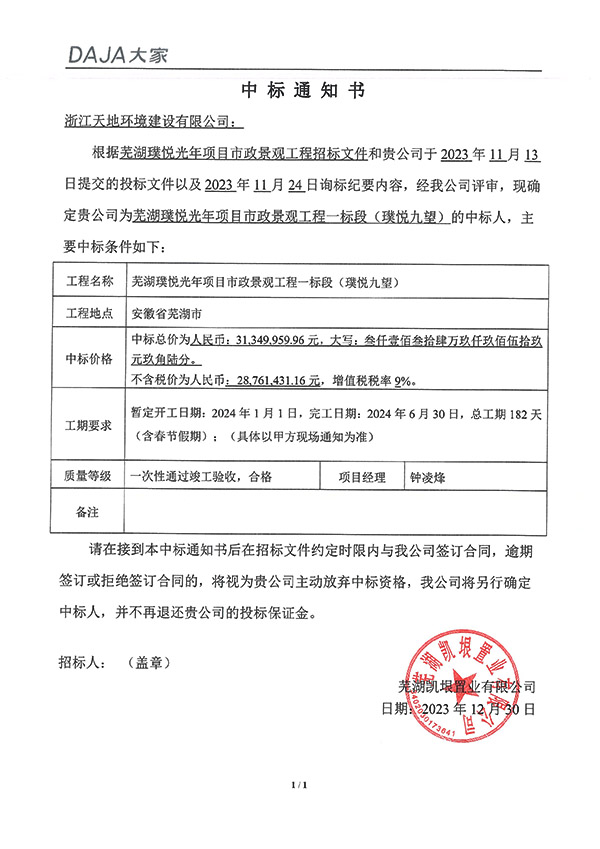 芜湖璞悦光年项目市政景观工程一标段(璞悦九望),中标合同金额为: