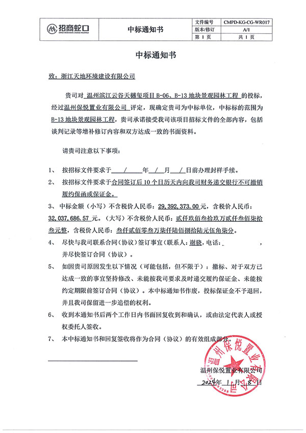 温州滨江云谷天樾玺项目B-13地块景观园林工程,项目绿化面积为33770平方米,中标金额为32037686.57元。
