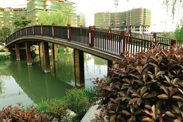 拱桥是草庄公园另一个重要构筑物,桥面铺装使用了一种新型木塑材料——龙豪木。龙豪木通过在塑料、木粉中添加纤维聚合物等材料复合而成。这种独特的生产方法使龙豪木具备硬度高、稳定性好、质地轻、不怕日晒和雨水侵蚀的特性。与天然木材相比较,龙豪木不易退色、耐老化、耐腐蚀、不翅曲、不变形、无节疤、不虫蛀、抗静电和紫外线、绝缘、隔热、阻燃、吸水性小,即使泡在水里也不会变形,可抗75℃高温和-40℃的低温。姜娟红表示,龙豪木能够带来极为自然的装饰效果,但考虑到其承载力有限,这种材料只能作为饰面材料,不能作为主体受力材料使用。