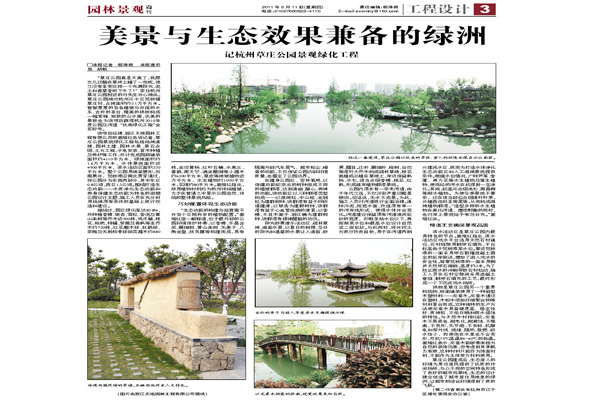 本公司城建项目------草庄公园景观绿化工程,获得2010年杭州市优秀园林绿化工程金奖,由协会推荐至中国花卉报,该报记者郭泽丽女士报道该工程,文章发表于2011年8月11日(总第3012期)园林景观第3版。