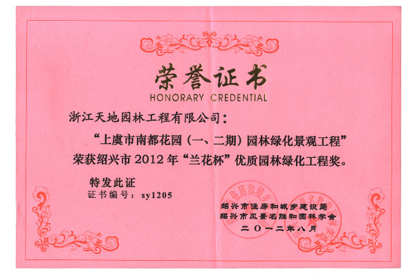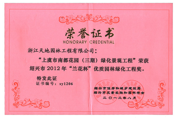我公司承建的南都花园一期园林绿化景观工程、南都花园(二期)园林绿化景观工程,南都花园(三期)园林绿化景观工程,均获的了绍兴市2012年度“兰花杯”优质园林绿化工程的称号。