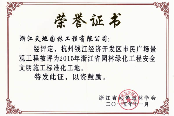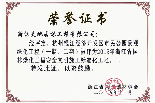 根据《关于申报“2015年浙江省园林绿化工程安全文明施工标准化工地”的通知》(浙园学〔2015〕3号)要求,我学会按规定程序,组织对申报2015年浙江省园林绿化工程安全文明施工标准化工地的项目进行了阶段检查,不定期抽查和综合评审,并经公示无异议,评定“杭州钱江经济开发区市民公园景观绿化工程(一期、二期)”等72个项目获“2015年浙江省园林绿化工程安全文明施工标准化工地”,现予以公布。