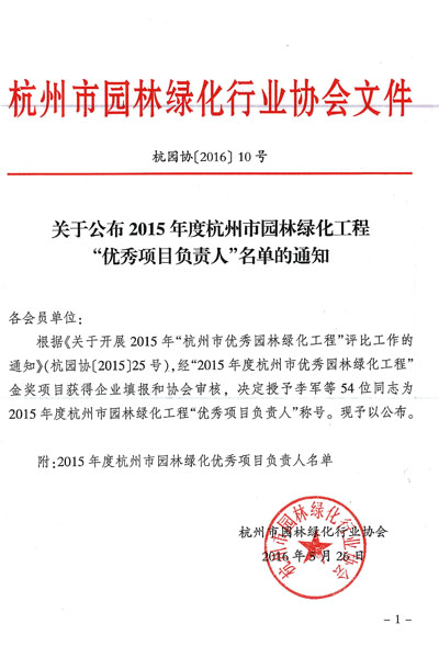 根据《关于开展2015年“杭州市优秀园林绿化工程”评比工作的通知》(杭园协〔2015〕25号),经“2015年度杭州市优秀园林绿化工程”金奖项目获得企业填报和协会审核,决定授予李军等54位同志为2015年度杭州市园林绿化工程“优秀项目负责人”称号。现予以公布。