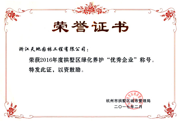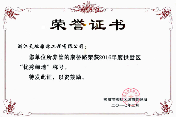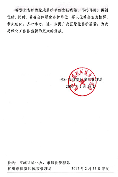 2017年2月23日在拱墅区城管局召开绿化养护工作会议中,我公司获得“优秀企业”称号,我公司养护的康桥路绿地养护项目,获得“优秀绿地”称号。这是对我们过去努力工作的肯定,同时也是对我们未来工作的期望,我们天地人将会以更加饱满的精神投身到未来的工作中,为美丽杭州付出自己的一份力。